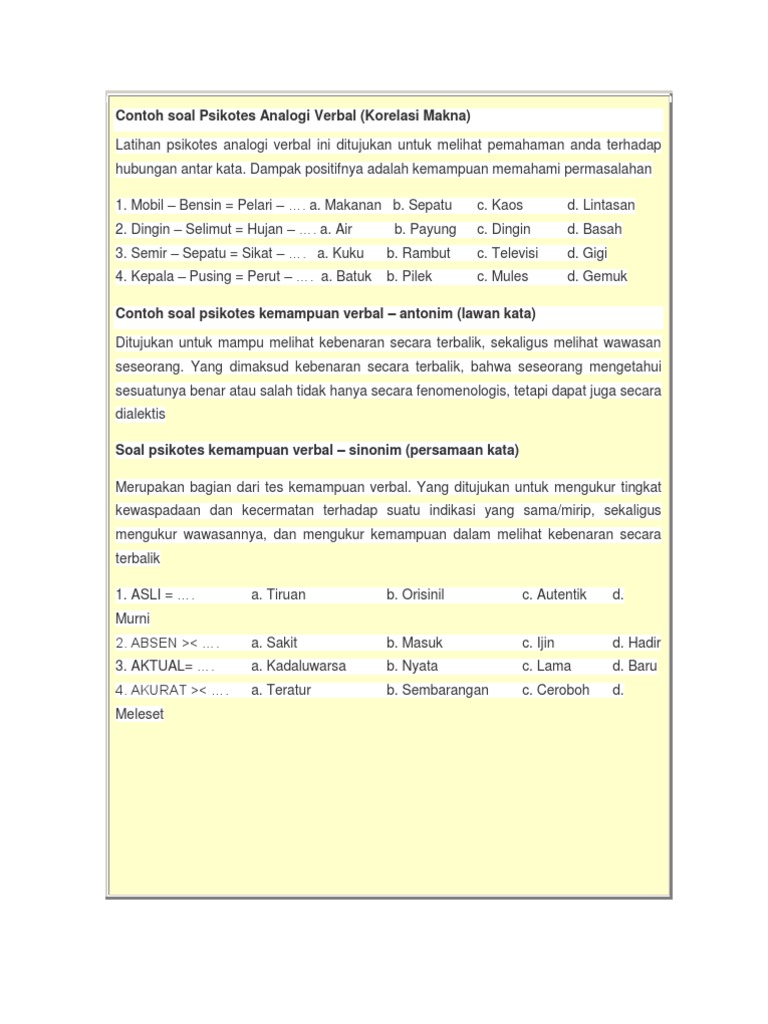 Bila kurang dari 15 menit cek. Dampak positifnya adalah kemampuan memahami permasalahan. Sebagai bahan latihan berikut contoh soal yang bisa kami bagikan 50 soal untuk anda coba. Latihan psikotes analogi verbal korelasi makna latihan psikotes analogi verbal ini ditujukan untuk melihat pemahaman anda terhadap hubungan antar kata.