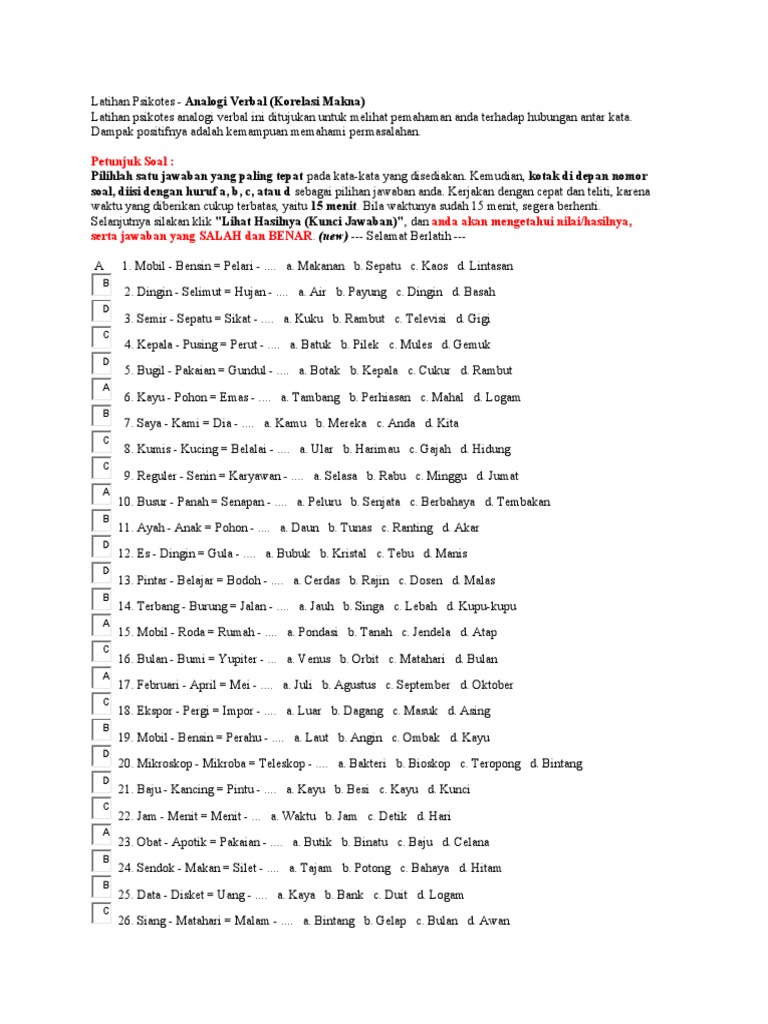 Analogi verbal korelasi makna mobil bensin pelari. Analogi verbal korelasi makna beserta kunci jawaban yang dapat anda download di akhir artikel dengan format pdf dan word. 1pilihlah satu jawaban yang paling tepat pada kata kata yang disediakan. Kunci jawaban psikotest. Pilihlah satu jawaban yang paling tepat pada kata kata yang disediakan.