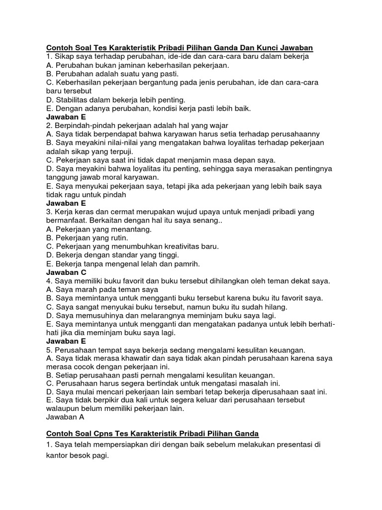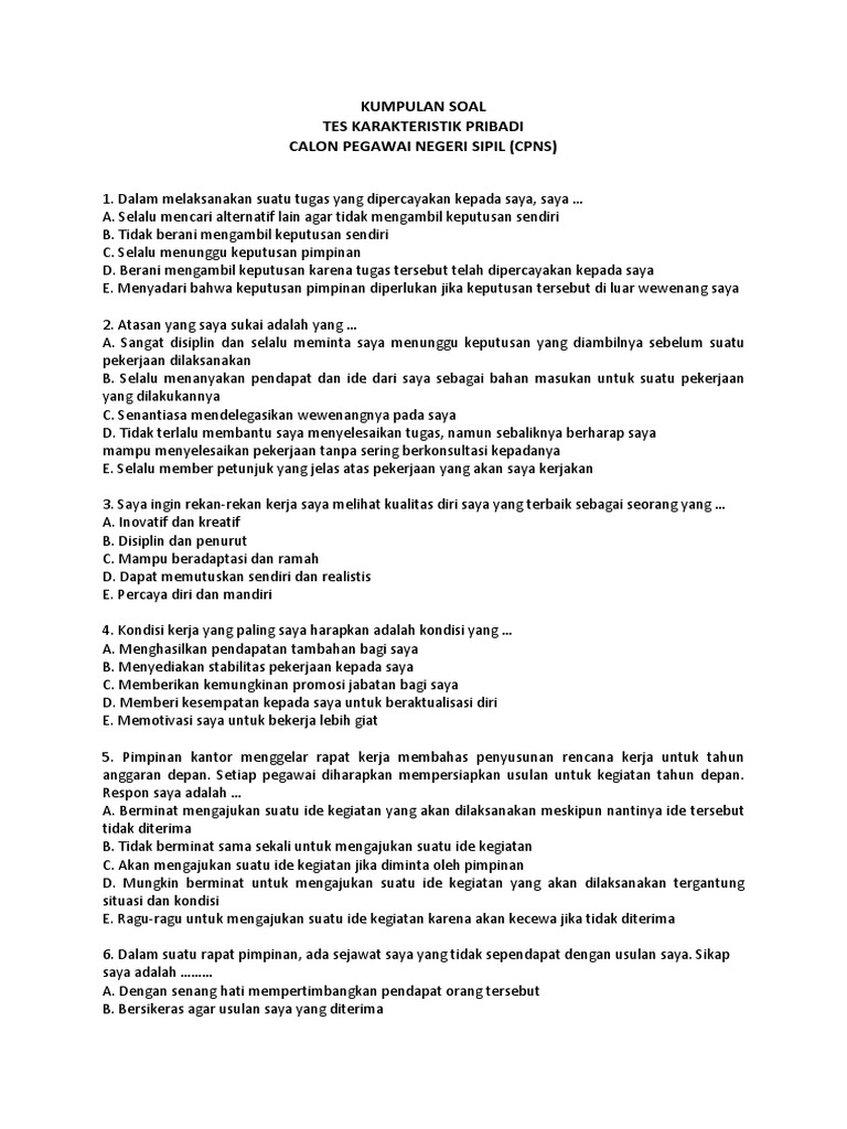 Contoh soal tes karakteristik kepribadian. Tes karakteristik pribadi cpns juga akan mengukur kemampuan seorang peserta tes disaat dia mengkoordinir me manage dan memimpin orang lain. Kompetisi berlaku untuk latihan soal tes cpns. Cek seperti tinggi dan berat badan tes buta warna dan rabun jauh cek tekanan darah dan cek telinga hidung dan tenggorokan tht adalah beberapa tes yang akan kamu jalani nantinya. Baiklah berikut ini akan saya jabarkan beberapa contoh tes kepribadian dan jawabannya yang bisa anda manfaatkan sebagai bahan bacaan sekaligus bahan belajar untuk memantapkan diri anda di dalam mengikuti tes psikotes kepribadian masuk ke dalam sebuah perusahaan atau instansi kerja lainnya sesuai dengan yang anda idam idamkan.