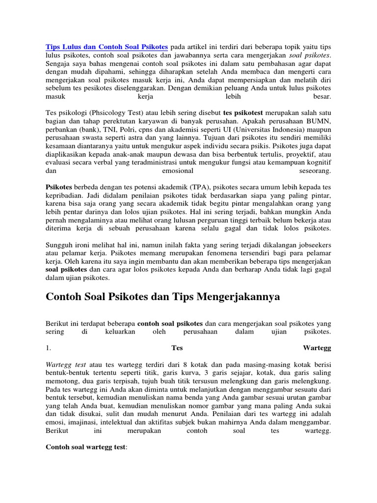 Tes tertulis usm stan terdiri dari tes potensi akademik tpa dan tes bahasa inggris tbi dengan jumlah soal tpa 120 soal dengan waktu pengerjaan total 100 menit dan jumlah soal tbi 60 soal dengan waktu pengerjaan total 50 menit. Yang menurut teori manusia memiliki 16 kepribadian yang berbeda. 20 contoh soal tes psikotes kepribadian jawaban dalam proses rekrutmen banyak perusahaan yang mengadakan psikotes bagi para pelamarnya. Biasanya psikotes tersebut dilakukan untuk melihat kemampuan dan kecocokan kepribadian pelamar dengan budaya kerja perusahaan.