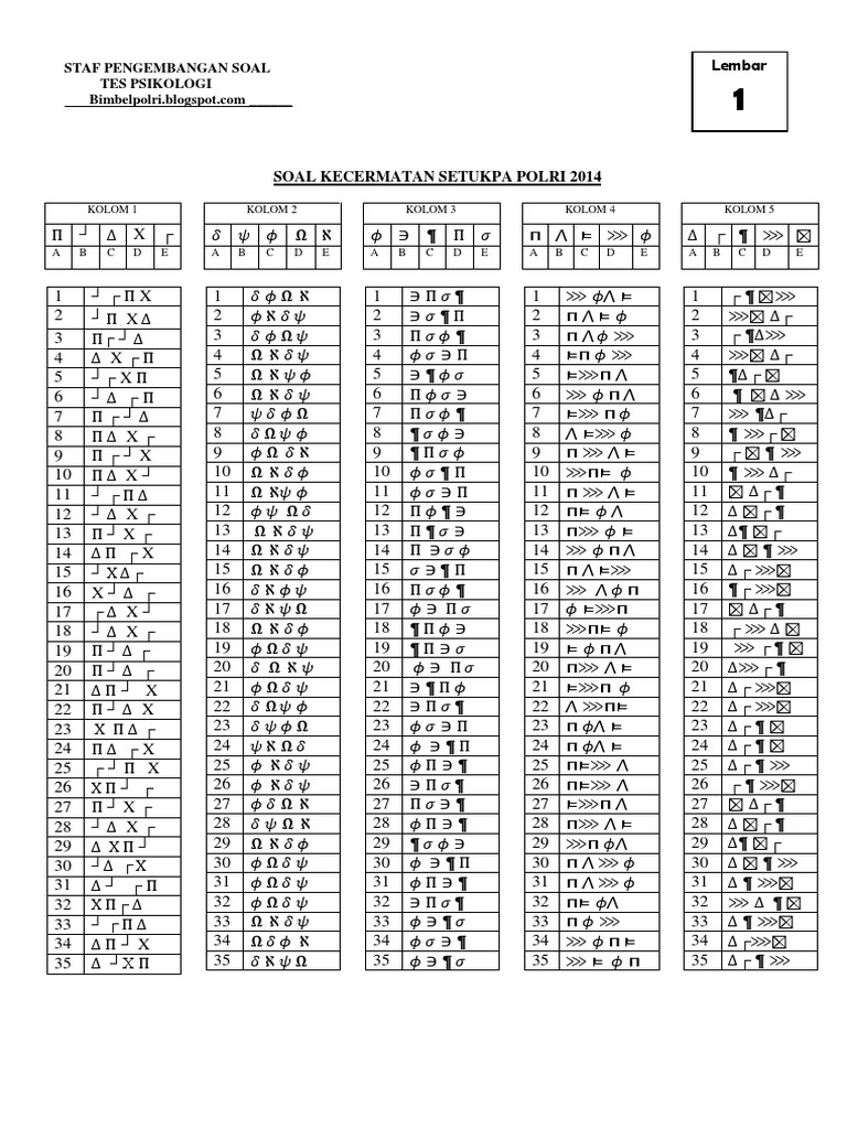 Soal psikotes polri pdf download download. Setiap soal mempunyai lima pilihan dan anda memilih satu jawaban yang paling. Petunjuk soal simbol hilang soal simbol hilang mirip dengan huruf hilang dan angka hilang di bagian atas soal terdapat pilihan ganda soal seperti di bawah ini. Contoh soal psikotes tes kecermatan angka hilang huruf hilang bimbel online polisi 2020 05 15t15 14 00 07 00 5 0 stars based on 35 reviews contoh soal tes kecermatan akpol sipss bintara tamtama tes kecermatan pada prinsipnya merupakan jenis tes yang menuntut kejelia.