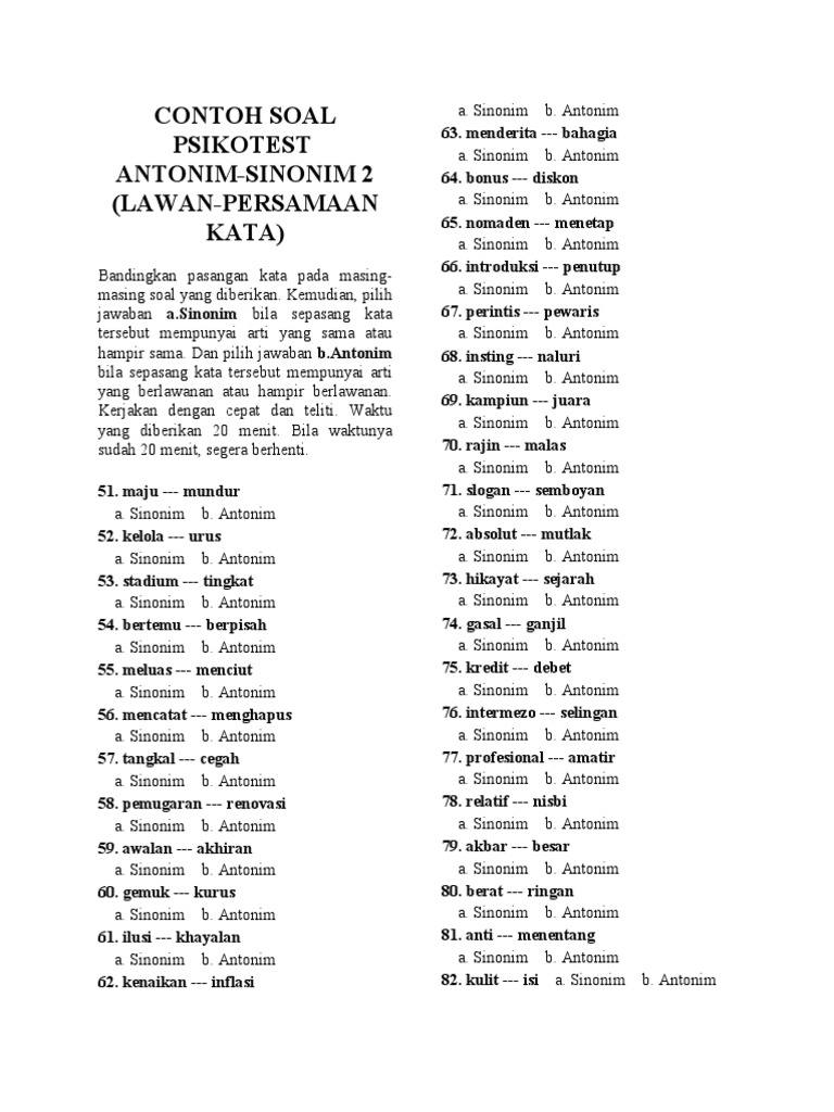 Tes psikotes ini merupakan bagian dari ujian psikotes kerja. Dalam pertanyaan tersebut ada 2 dua kata sebagai pertanyaan dan pilihan jawaban adalah apakah pasangan kata adalah pasangan kata sinonim atau antonim. Tes dapat berbentuk tertulis visual atau evaluasi secara verbal yang teradministrasi untuk mengukur fungsi kognitif dan emosional. Latihan psikotes antonim sinonim adalah untuk mengukur kemampuan verbal anda mengenai persamaan dan kata kata.