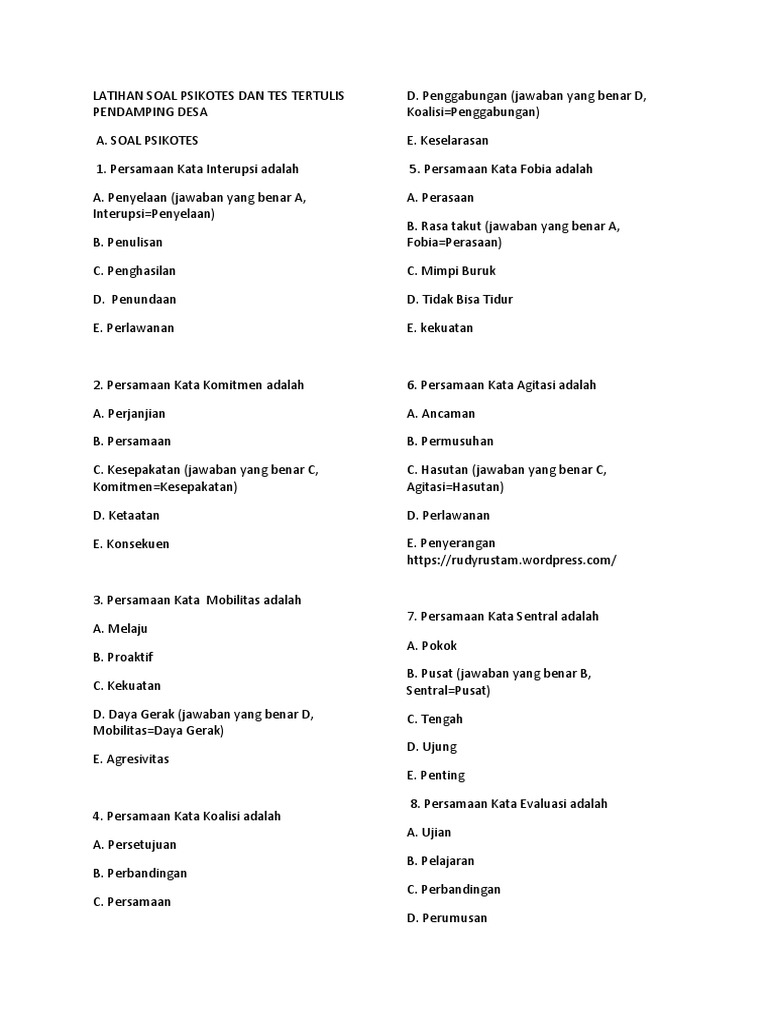 1 1 contoh soal psikotes persamaan kata sinonim sinonim atau persamaan kata sudah tidak asing lagi bagi kita bahkan sejak di sekolah dasar sd kita sudah belajar sinonim persamaan kata.